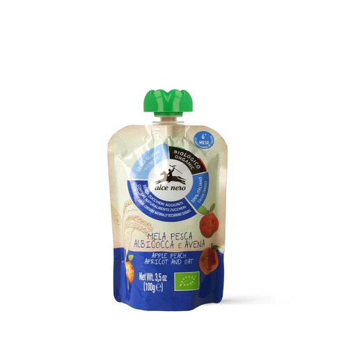 Ingredienti: purea di mela* (80%), purea di pesca* (13%), purea di albicocca* (5%), farina di avena* (2%). *Biologico.