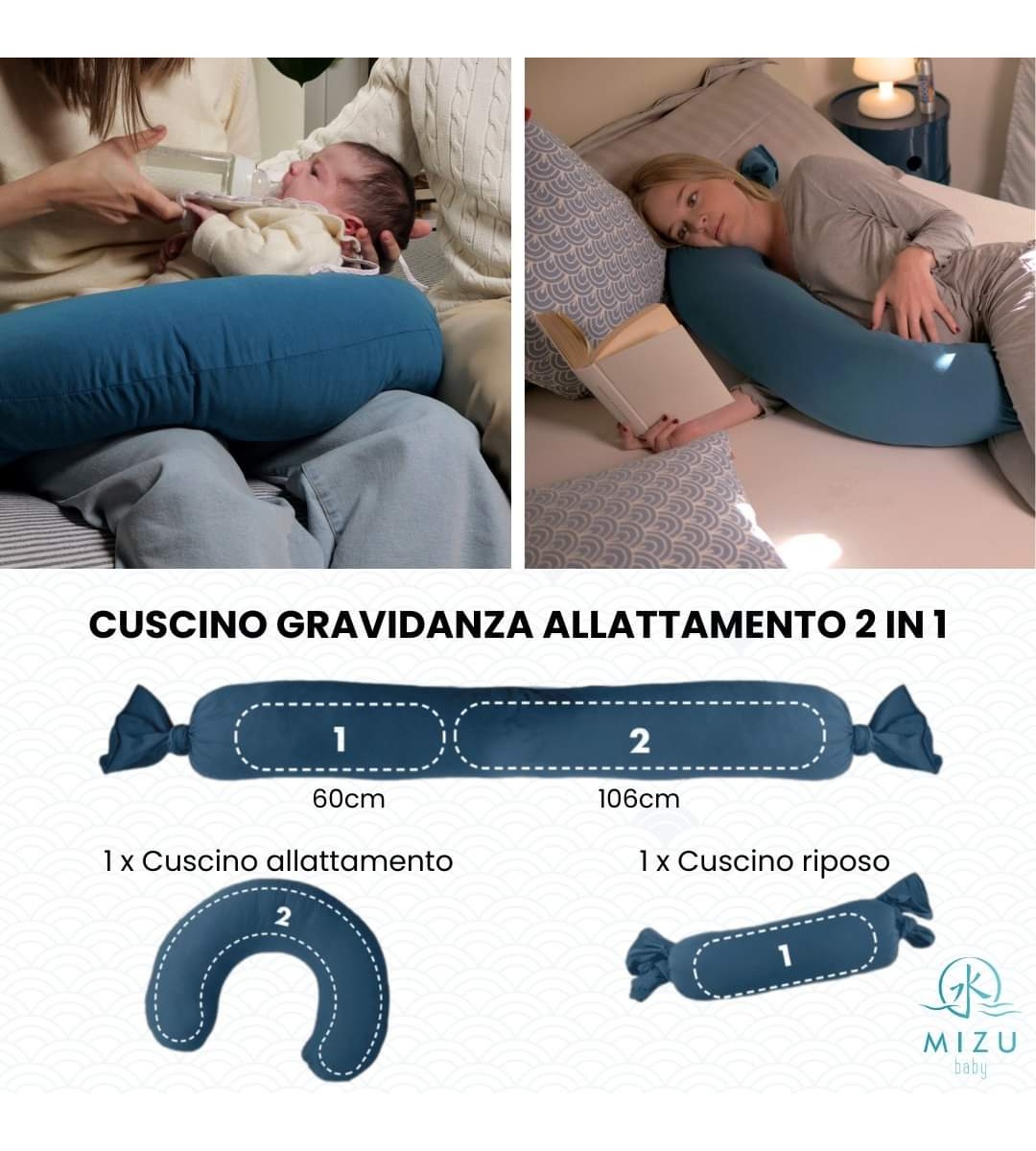 È dotato di due cuscini (uno da 106cm e uno da 60 cm) progettati per essere regolabili, consentendo di adattarlo facilmente alle tue esigenze specifiche durante le diverse fasi della gravidanza e dell\'allattamento